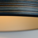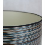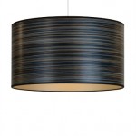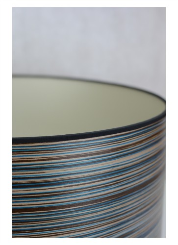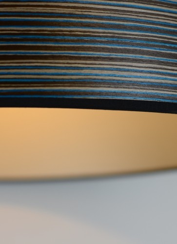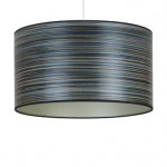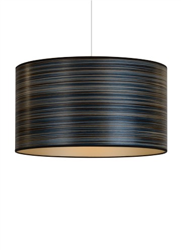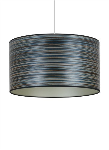 A striking blue stripe wood veneered drum shade with a chic champagne lining and black fabric trim. Each shade is sanded ultra smooth and then coated with an eco friendly water based satin finish. All of our drum shades are fitted with a base pendant to fit on lamp bases or hang from the ceiling.